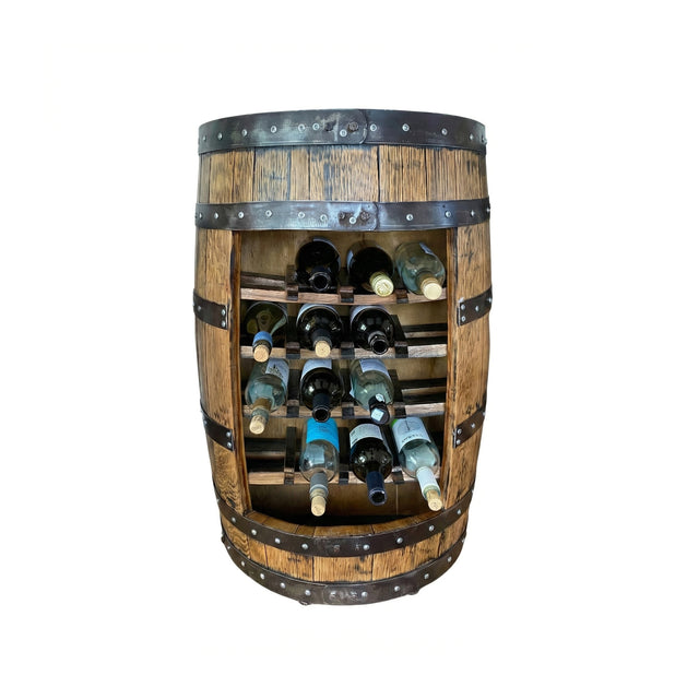 The Whiskey Barrel Wine Rack will showcase your wine collection with a stunning fusion of heritage and craftsmanship. Handcrafted from a genuine whiskey barrel, this bourbon wine barrel cabinet piece keeps your wine collection secure with durable materials, serving as a freestanding centerpiece to show off your exclusive wine collection. The barrel cabinet has ample space to hold 24 bottles of wine from your precious wine collection, while the top of the barrel can hold decorative items or everyday items to enhance your cabinet style. The intricate built-in-wine rack and wood detailing along with rich, vintage tones highlight the product colors and the natural beauty of the reclaimed barrel, creating a warm and inviting atmosphere, if you're a wine lover. This wine rack bar cabinet gives you plenty of space and durability. This bar cabinet wine rack holds your favorite wines and glasses while maintaining a rustic yet elegant style. Perfect for home bars, kitchens, or wine cellars, this one-of-a-kind wine rack is more than just storage but creates an exciting space. This cabinet with wine storage is a conversation starter and a timeless addition to your décor while showing off your collection in style.