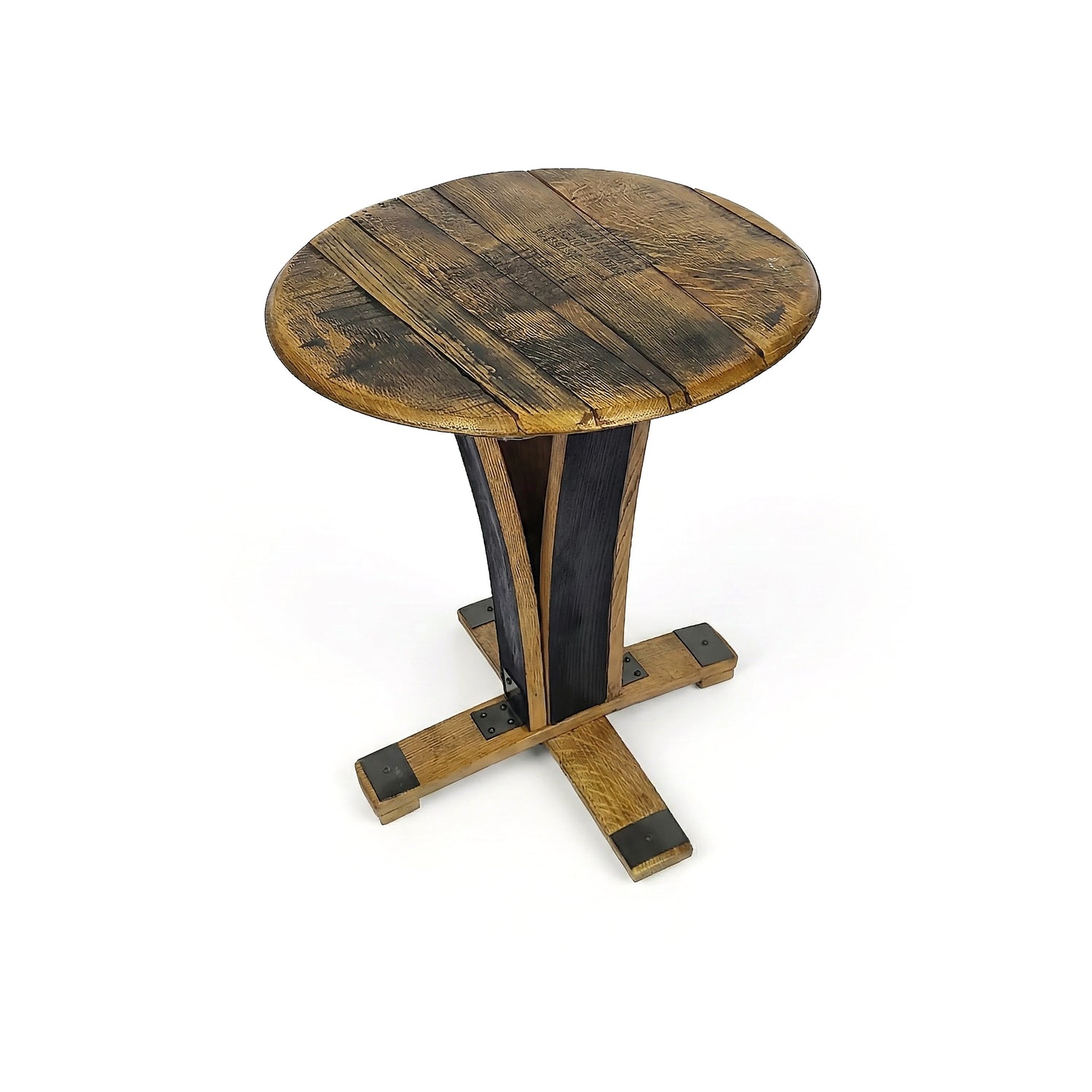 The Barrel End Table is a statement piece of rustic heritage and refined design, it is handcrafted from authentic reclaimed whiskey barrels, making it the perfect end table. Each table carries the natural grain, deep patina, and subtle markings from the barrel. Standing 26 inches tall, this table features a 22-inch round top giving you ample surface space for an accent lamp or your everyday essentials, making it blend with a wide range of decor styles. The sturdy pedestal base, formed from carefully fitted barrel staves, provides both stability, elegance and contemporary design. The metal detailing adds a modern design to the end table, along with structural support that stands the test of time. Designed to fit effortlessly into home space, cozy corners, or beside your favorite chair, it is a truly versatile piece. This solid wood end table brings artisanal craftsmanship and rustic charm, wherever you place it.