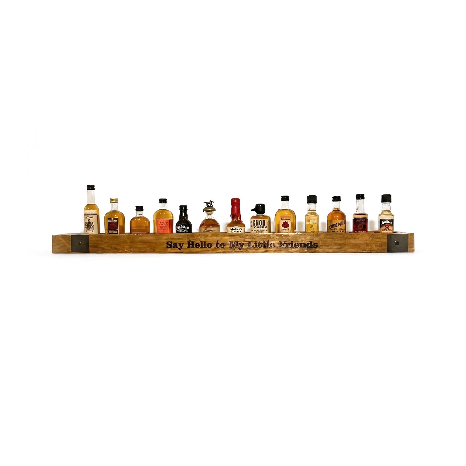 Showcase your collection of mini-bottles with this handcrafted bourbon barrel stave wood shelves, bringing both character and craftsmanship. Measuring approximately 35 inches long and 3 to 4 inches wide, this wall-mounted floating shelf is perfect display space for your favorite spirit bottles making it a truly functional item. Whether mounted above your home bar, in a cozy corner, or as a bold statement in your kitchen or living spaces, it adds a rustic touch to any room. This solid wood shelf is more than just a rustic wood shelf, this is a conversation piece and a functional work of art that celebrates bourbon heritage.